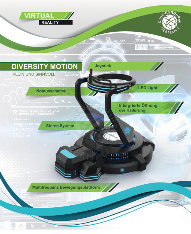 Das VR-Gerät simuliert Vibrationen und Erschütterungen vollkommen realistisch. Der Spielverlauf gestaltet sich hierbei folgendermaßen: die Spieler stehen auf der Plattform des Gerätes und sind parallel hierzu mit VR-Brillen ausgestattet. Sie spüren reale Auf- und Abwärtsbewegungen bzw. Seitwärtsbewegungen und dies alles synchronisiert mit der dargestellten Szenerie.