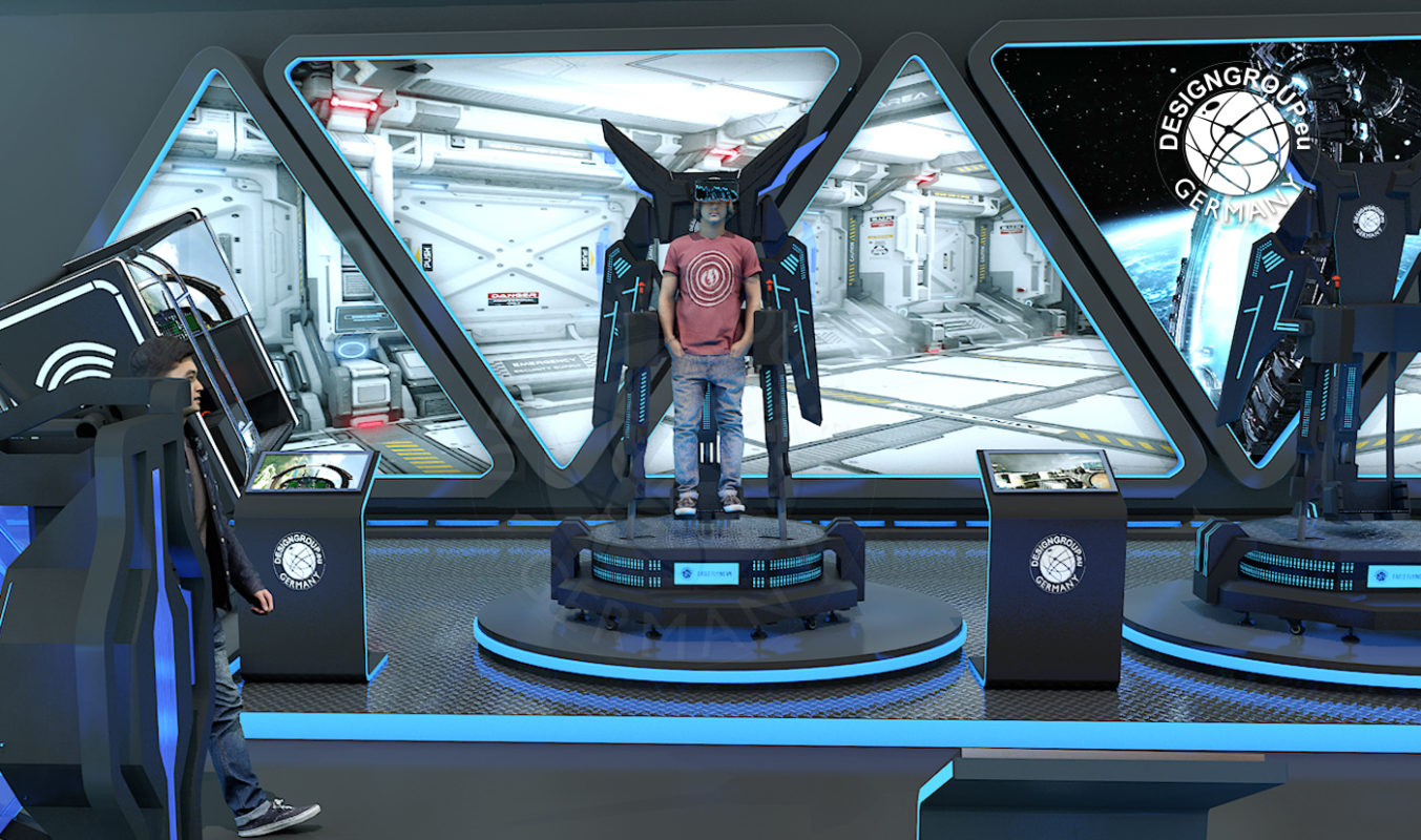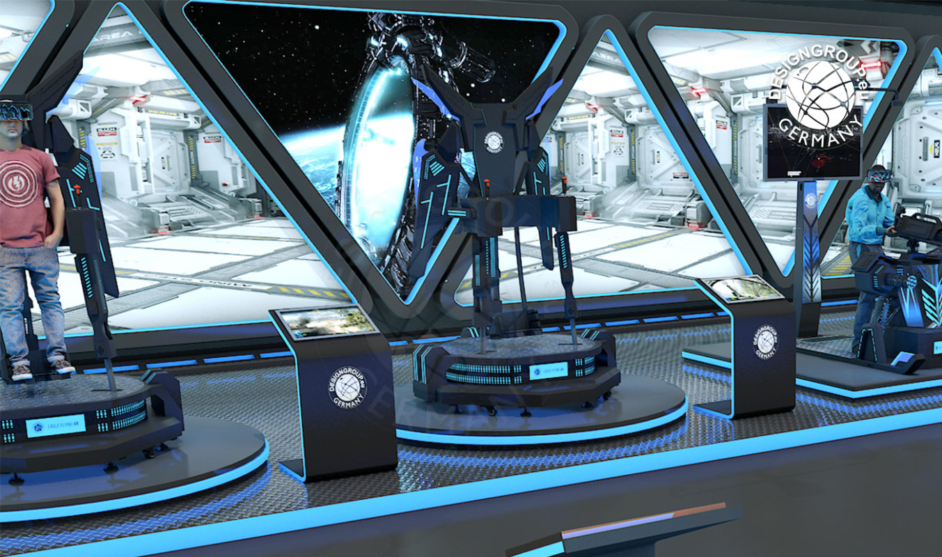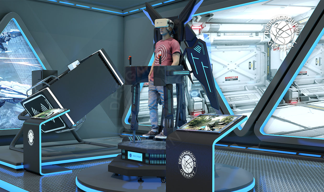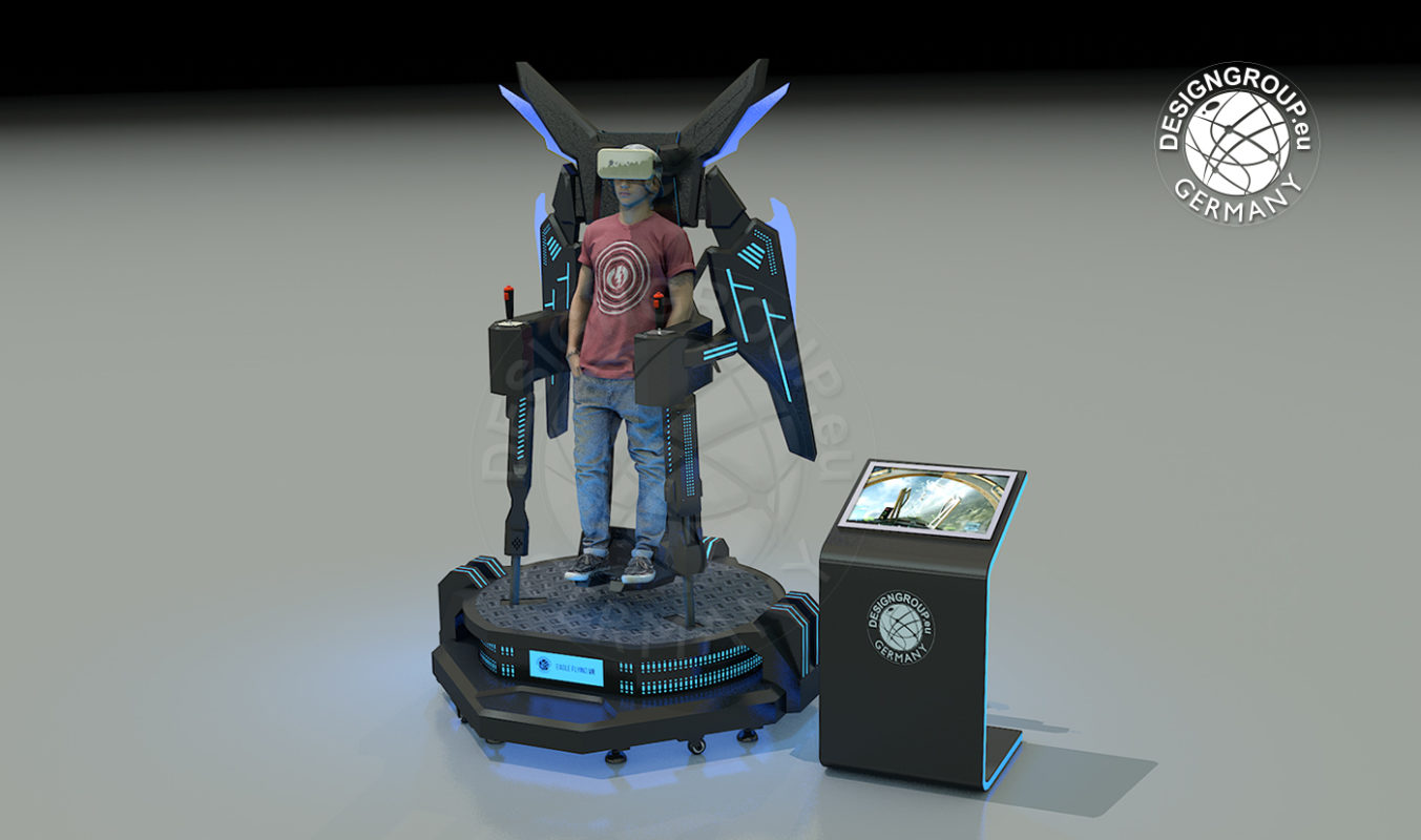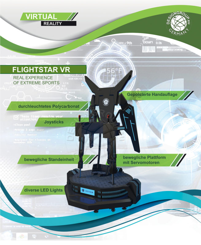 Dieser Flugsimulator ist einzigartig! Der Spieler, welcher ohne Kontakt zum Boden aufrecht, in einer Art Gestell steht, kann hierbei einen völlig realistischen Flugeindruck nachempfinden.